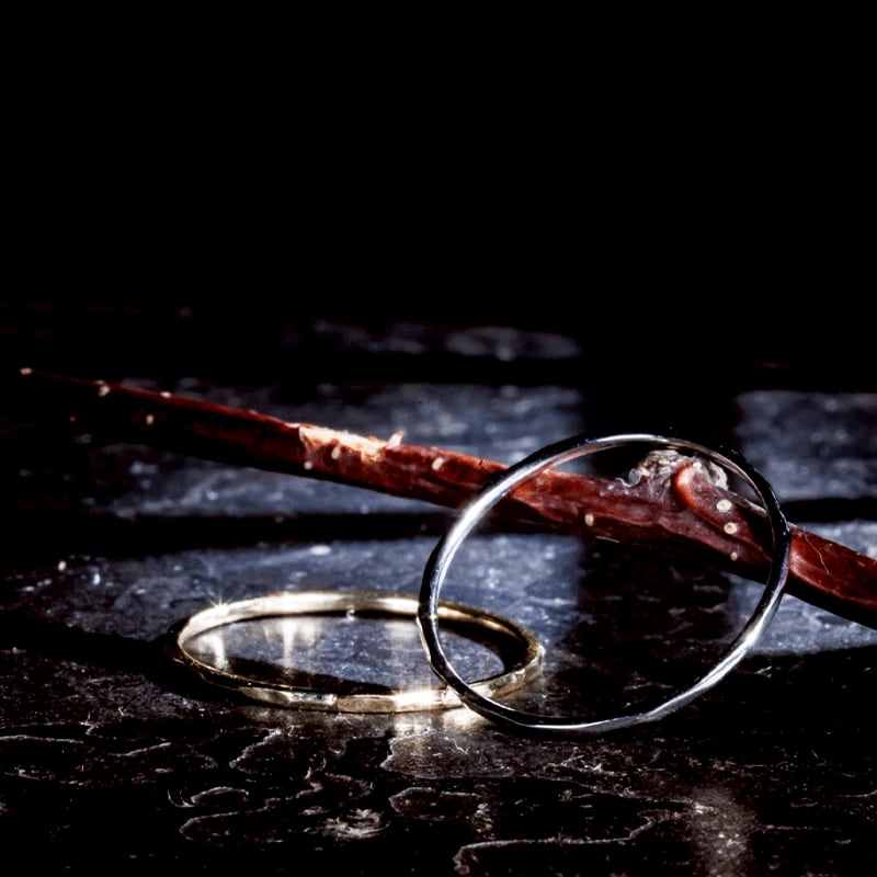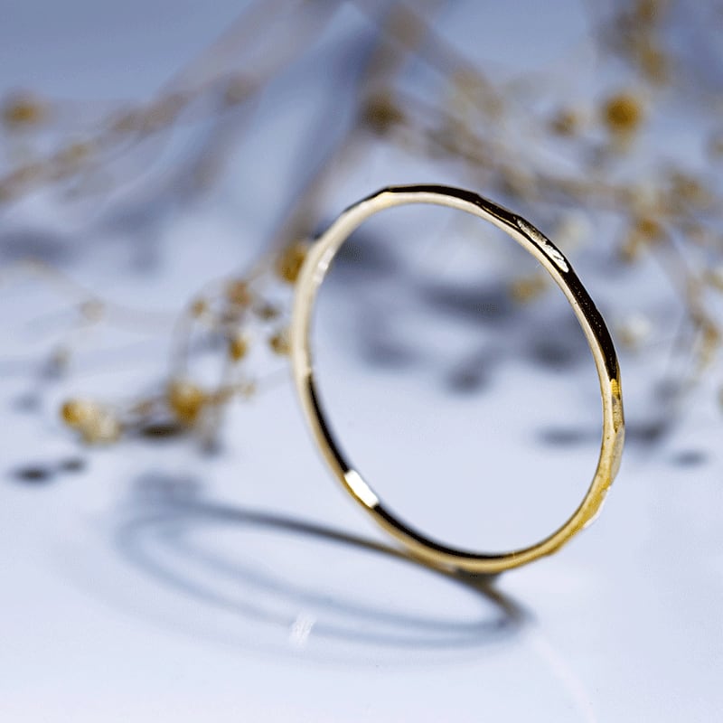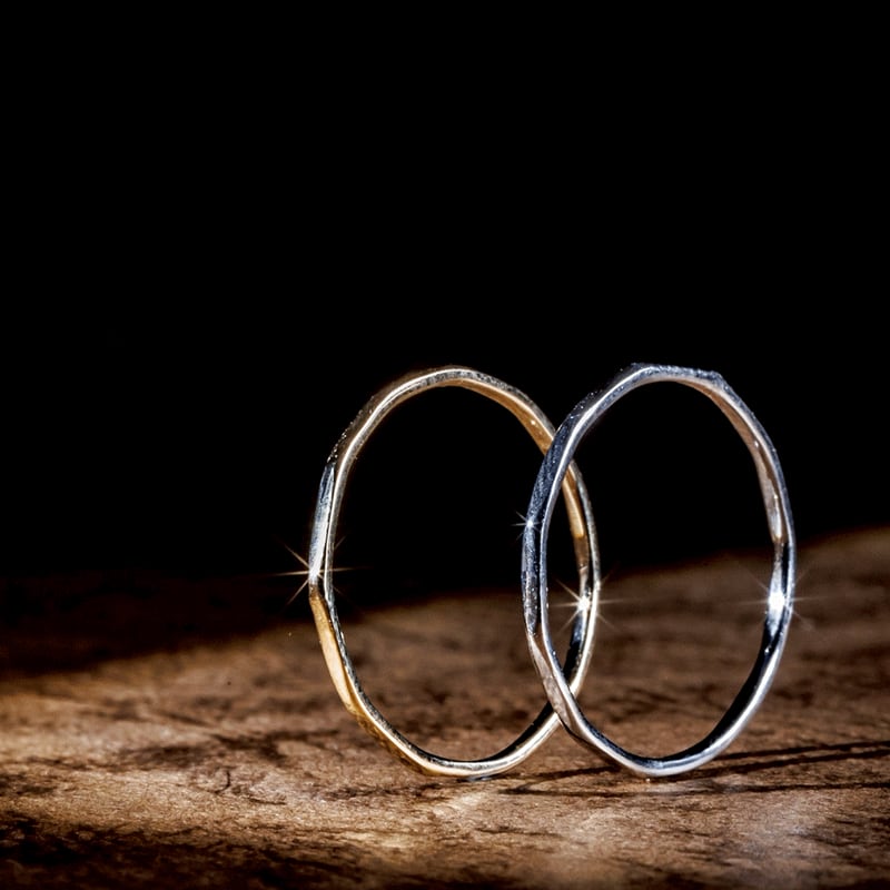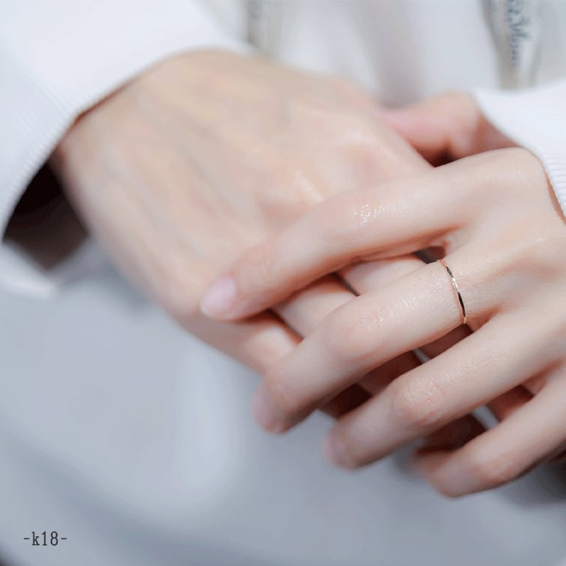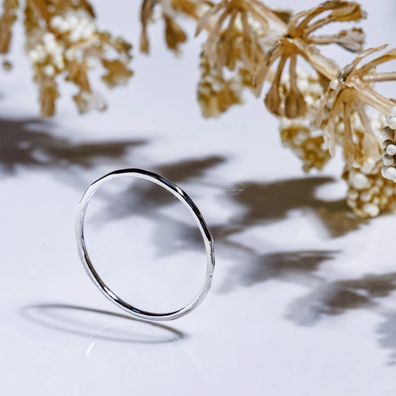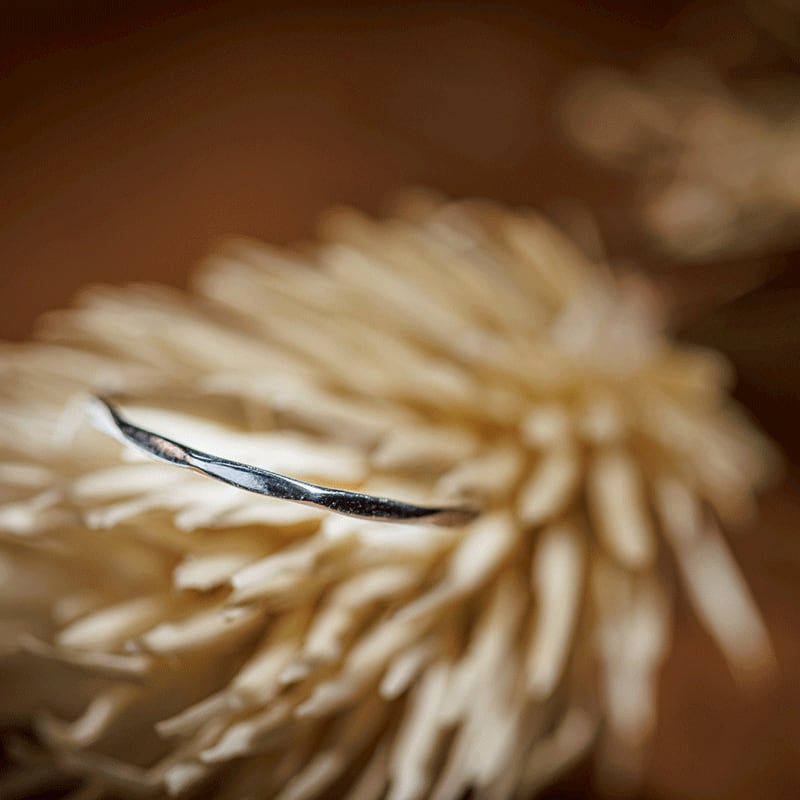 【Frele collection のアイテムは鍛造と呼ばれる手法を用いて制作しているため、繊細ながらも高い強度を実現しています。そのため変形に強く、普段使いにもおすすめです。また内甲丸という加工をすることで滑らかな指通りでストレスのない指輪となっております。】