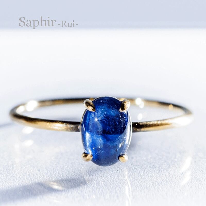 厳選したタイ産のサファイアをアンティーク加工を施したゴールドに重ね、石を爪留めすることで四方からの光を吸収し表情豊かなリングに仕上げました。